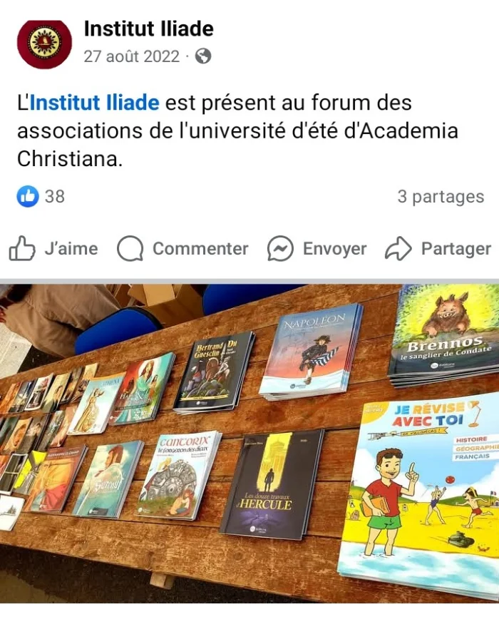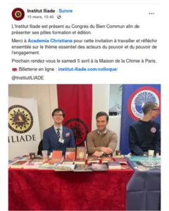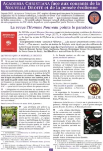 D’origine maçonnique, la Nouvelle Droite, le fascisme italien et le proudhonisme ambitionnent tous la mort de Dieu ; leur modernité ne fait donc plus de doute. Pourtant, malgré l’article de l’Homme Nouveau, Academia Christiana ignore toujours ces dangers, conserve les mêmes références, et continue sa collaboration avec l’Institut Iliade de la ND :