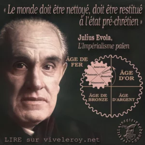 Nous professons et défendons […] la froide, positive, dure science et puissance de l’initiation, de la magie, de la réalisation païenne […] Le monde doit être nettoyé, doit être restitué à l’état pré-chrétien […] Ceci est notre vérité, et ceci est le seuil de la grande libération : la cessation de la foi, la libération du monde à l’égard de Dieu […] Notre Dieu peut être celui aristocratique des Romains, le Dieu des patriciens que l’on prie debout et la tête haute, et celui qu’on porte en tête des légions victorieuses, non le patron des misérables et des affligés que l’on implore aux pieds du crucifix, dans la défaite de tout son esprit 13.